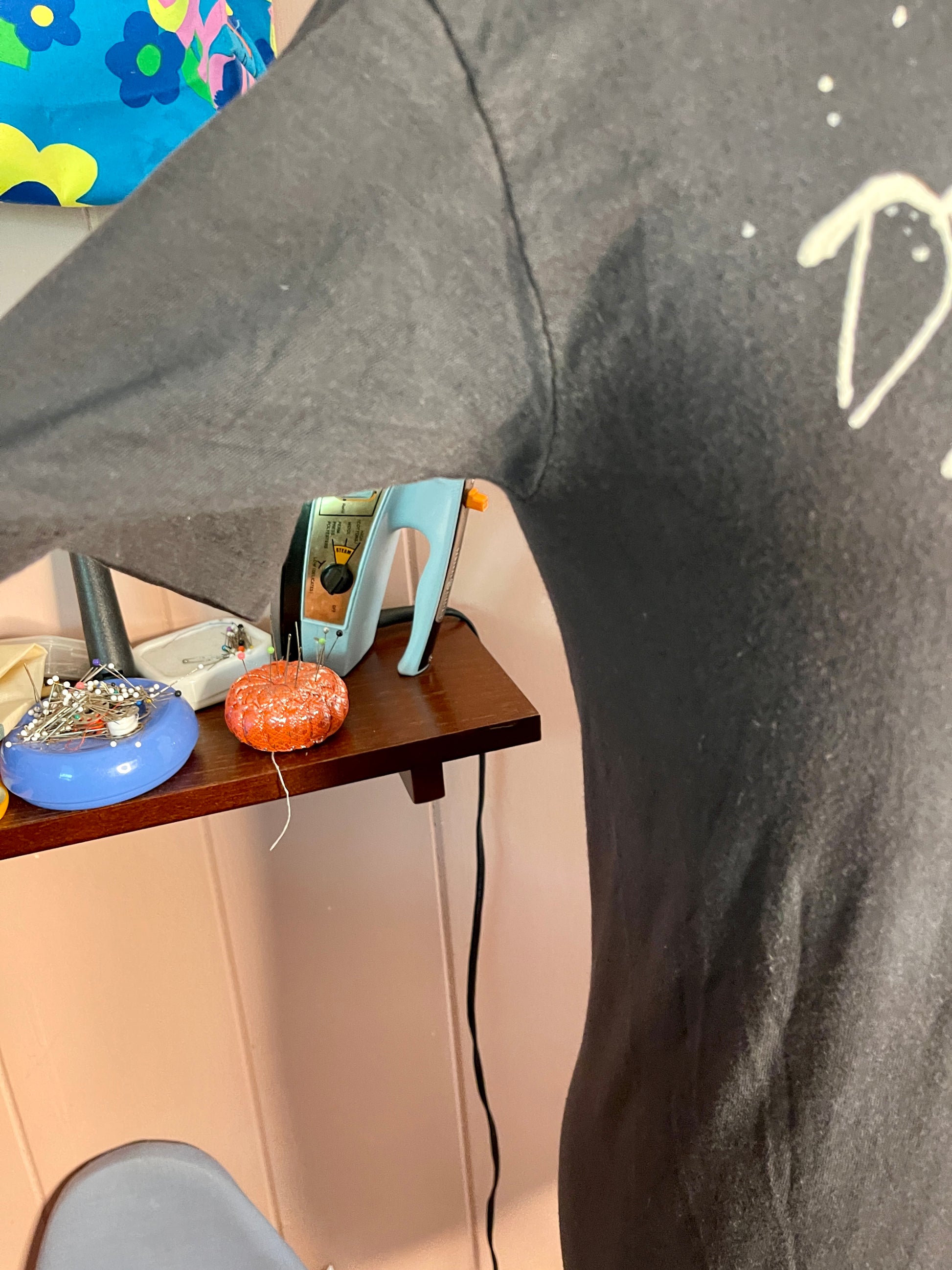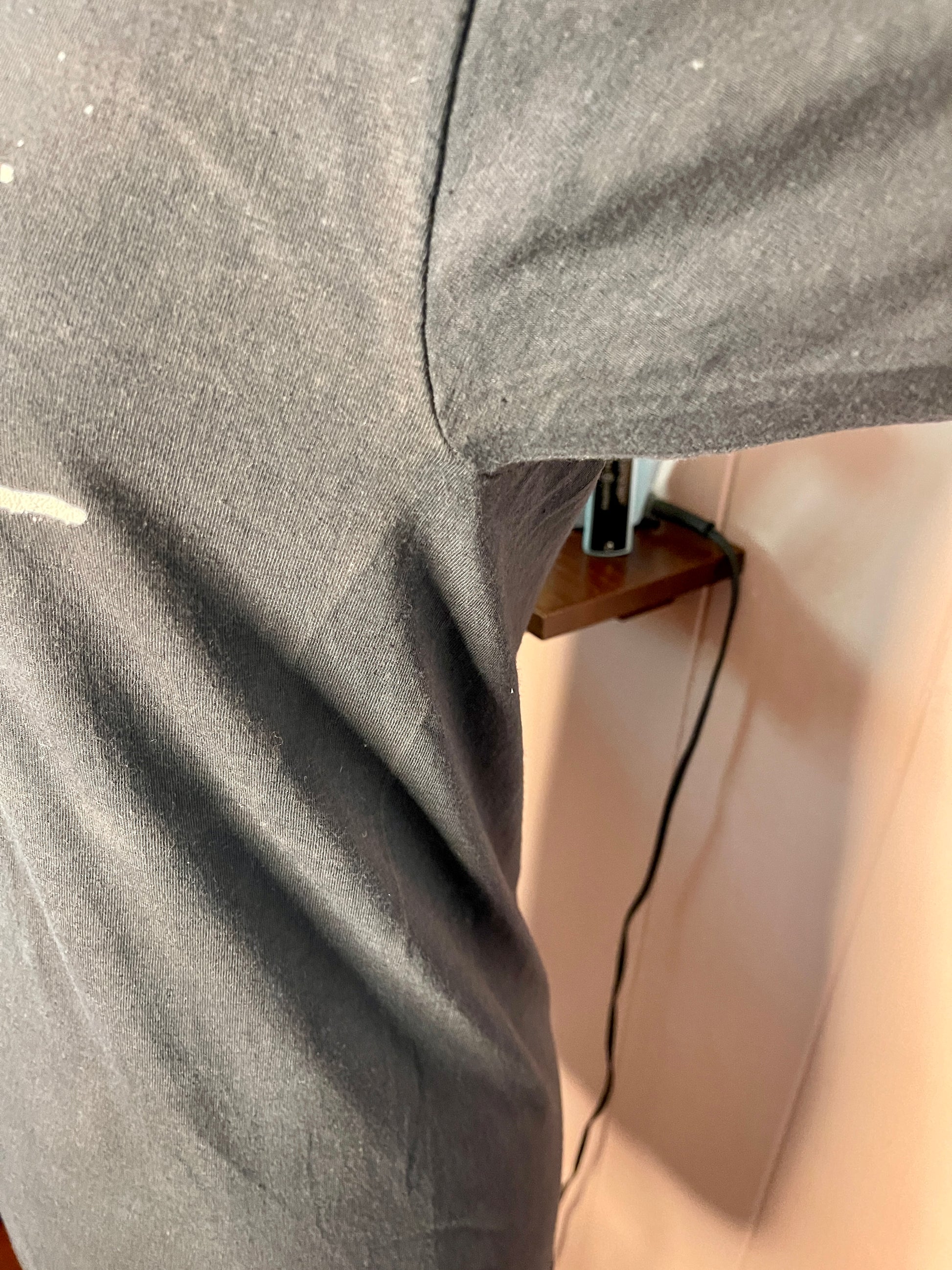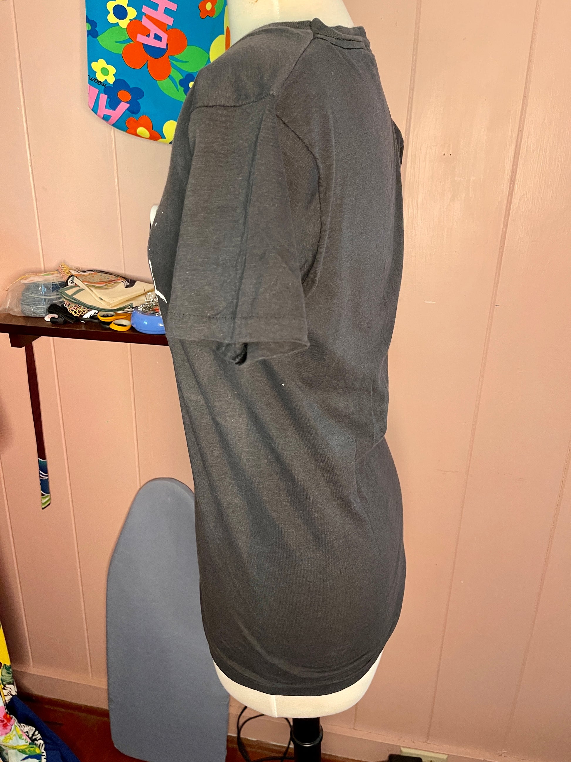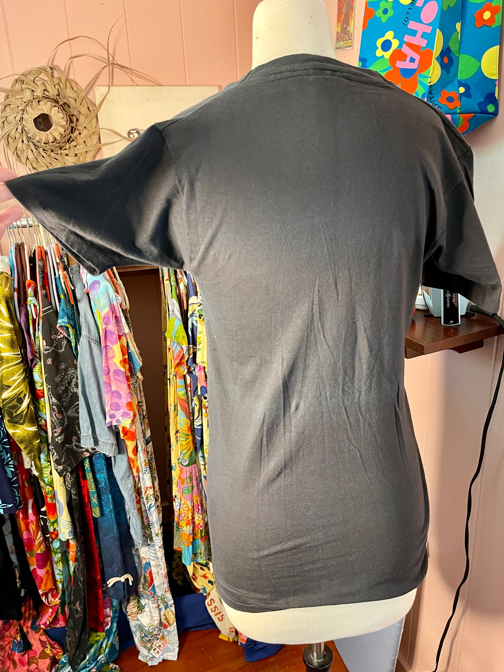 Black with white text, and slight discoloration on the stomach area on the shirt. See photos for item condition.