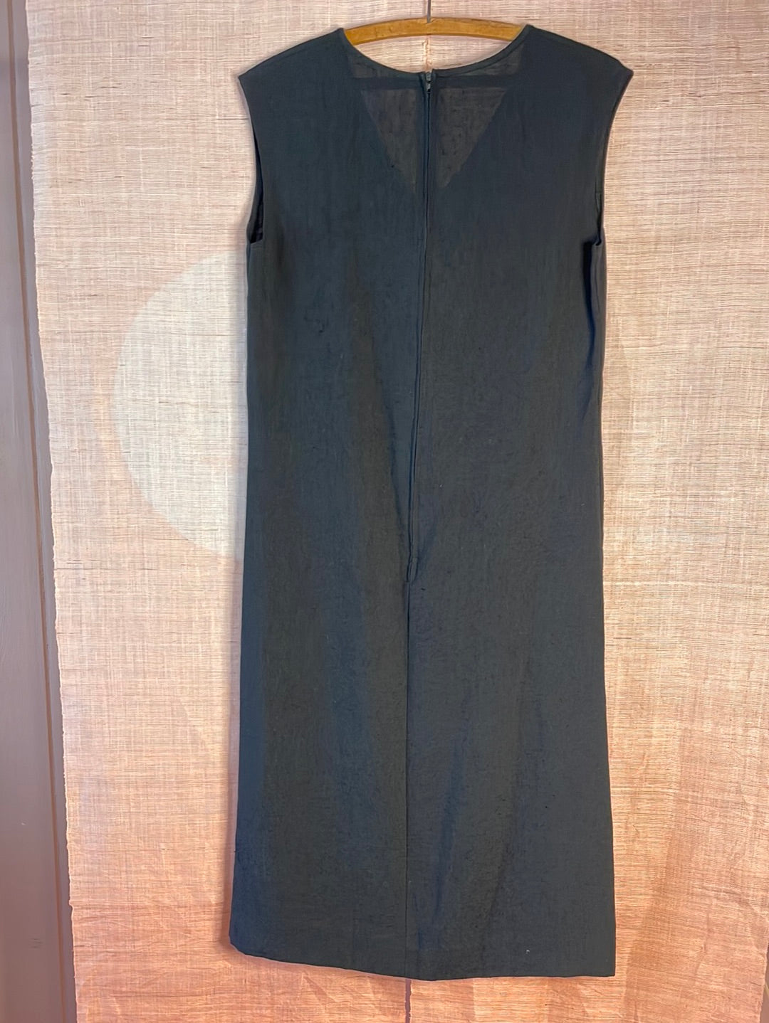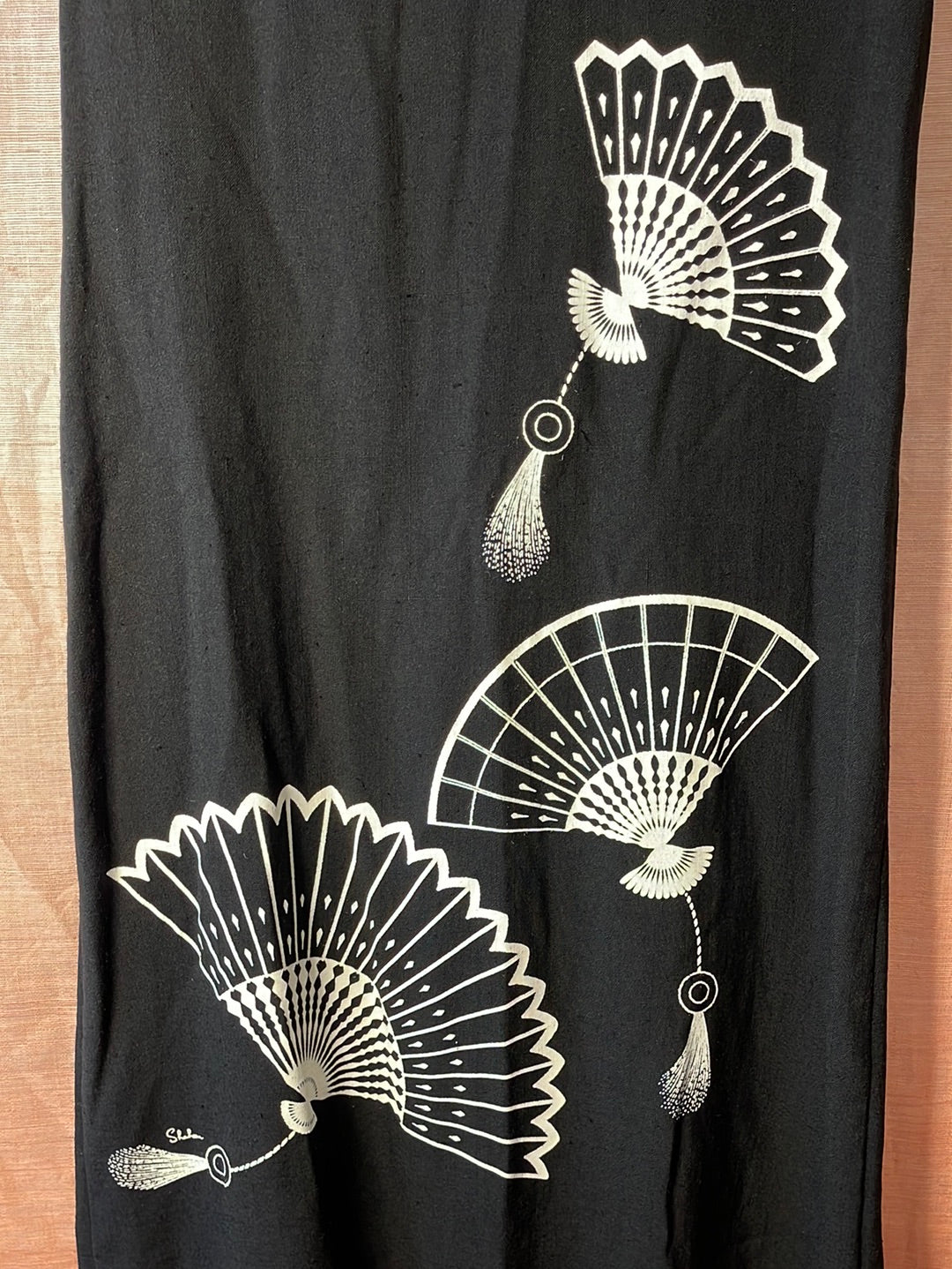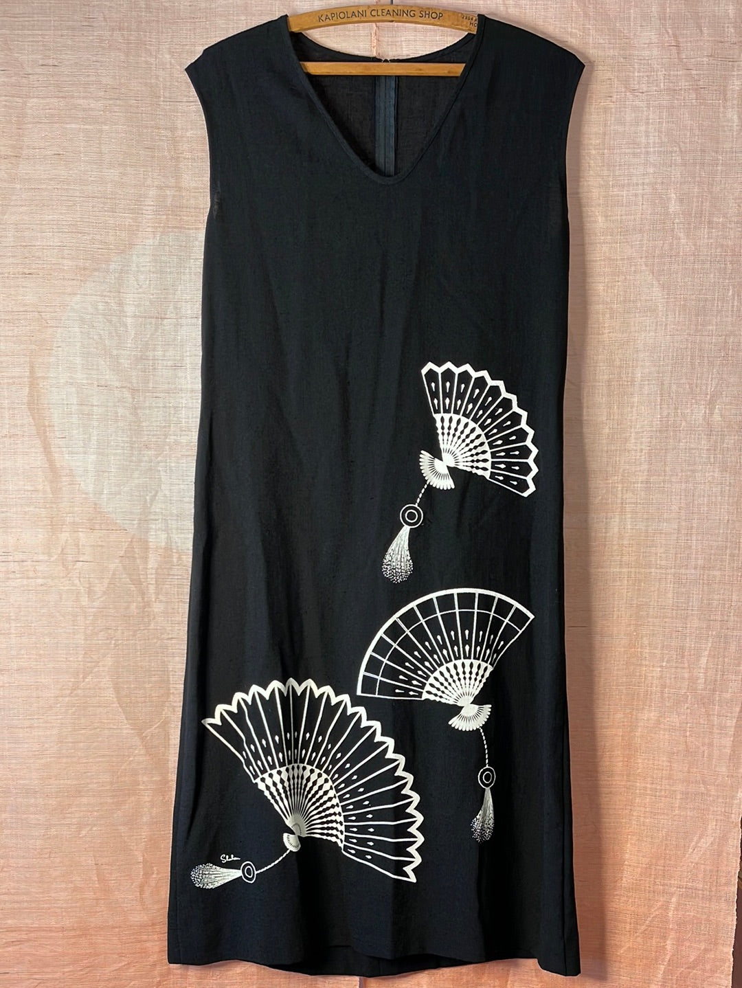 Rare Alfred Shaheen vintage Hawaii Black dress with three white Japanese style fans and Shaheen signature printed on front of dress, zippered back