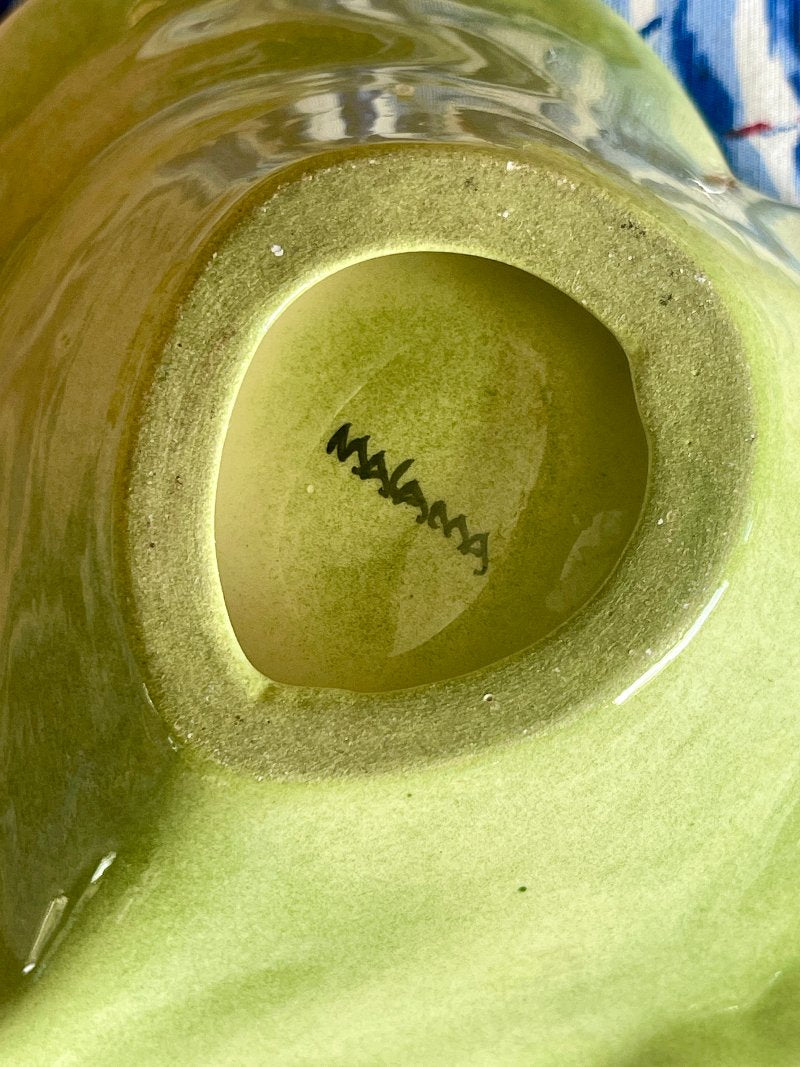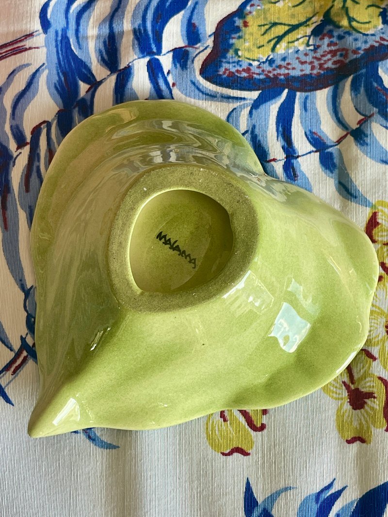 This ceramic vintage 70s trinket dish measures 5.25" x 5" x 1.75" tall x 1.25" depth and is engraved with "Malama" on the bottom.