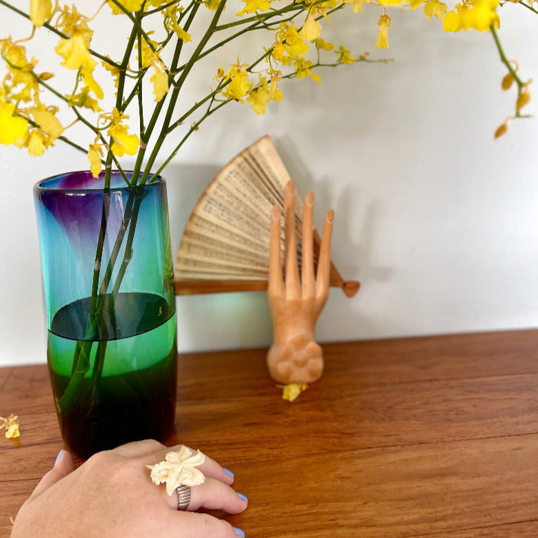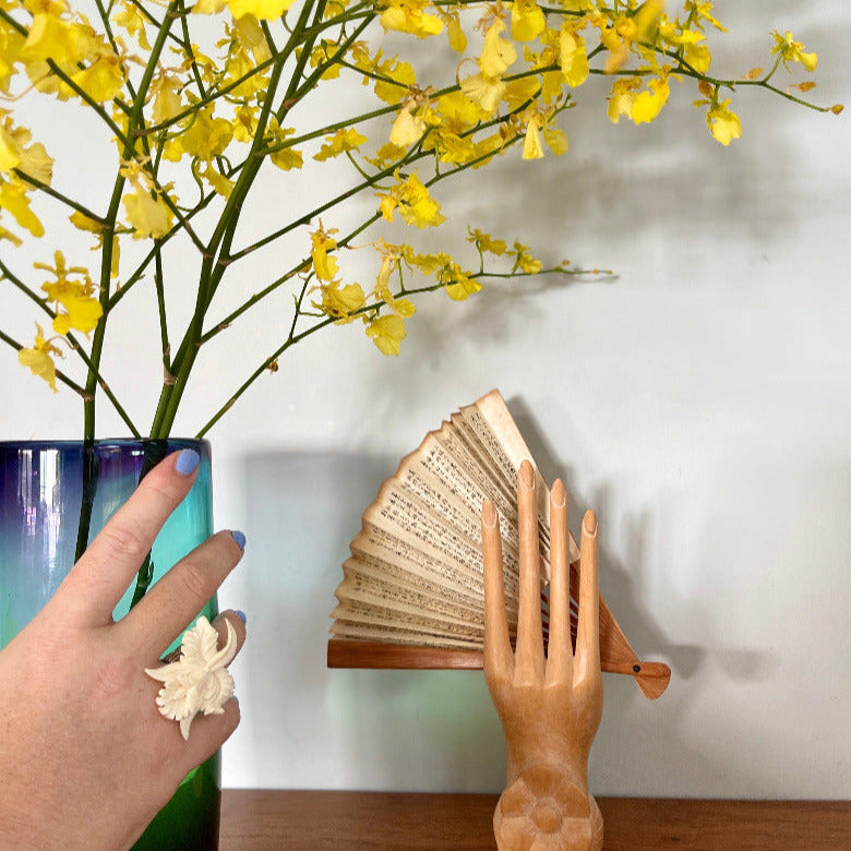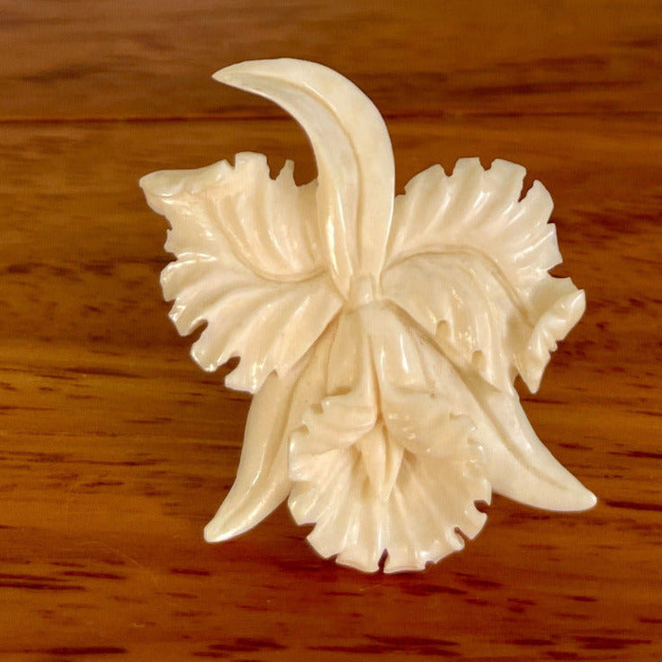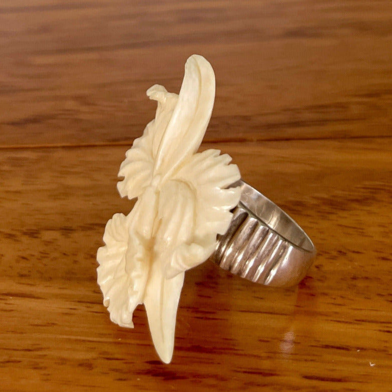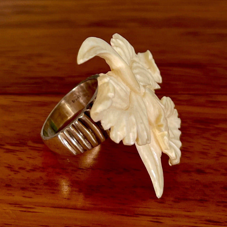 Ming’s of Honolulu circa 1940s-1950s, carved cattleya orchid set on a sterling silver band, with 925 sterling silver marked on the inner band.