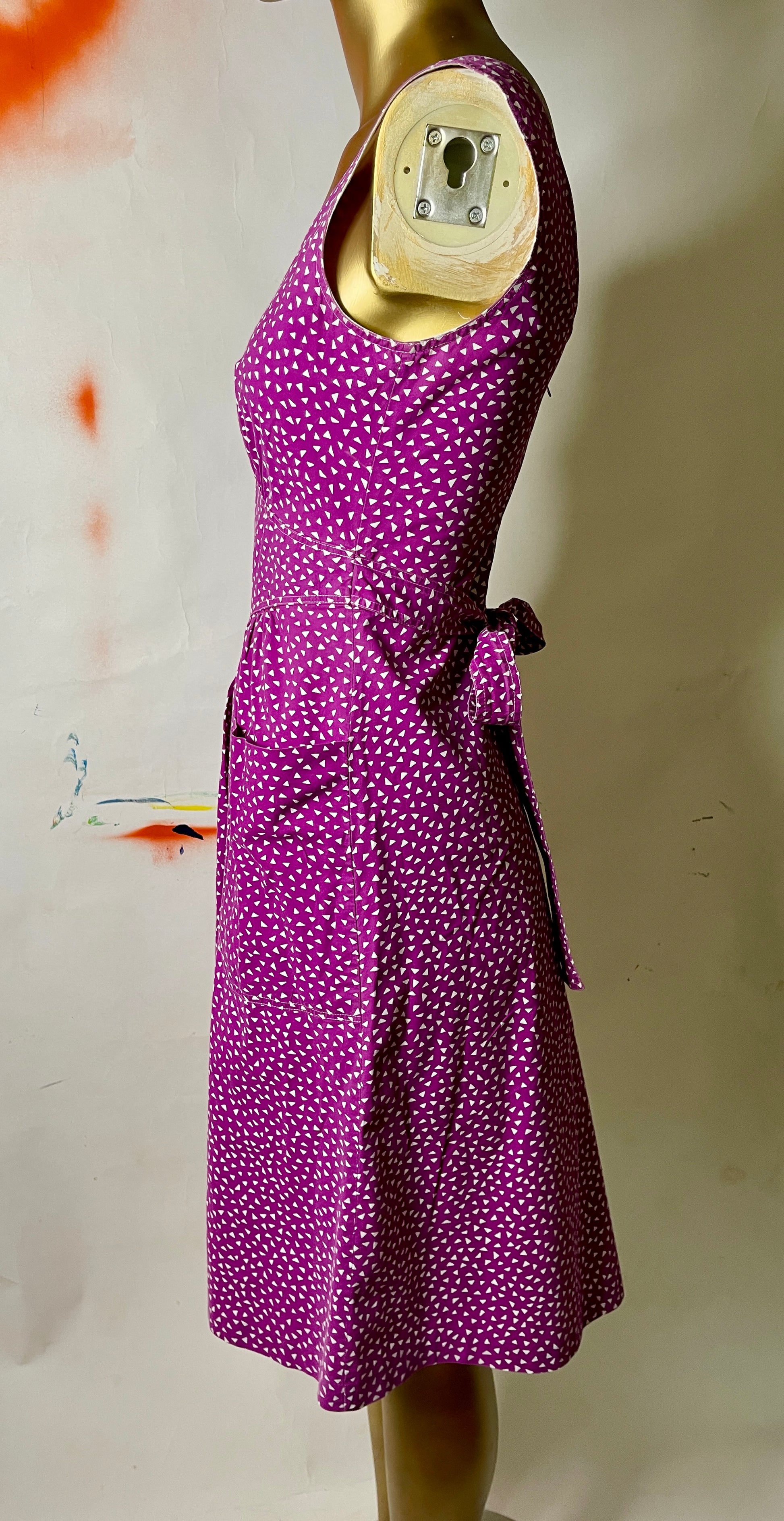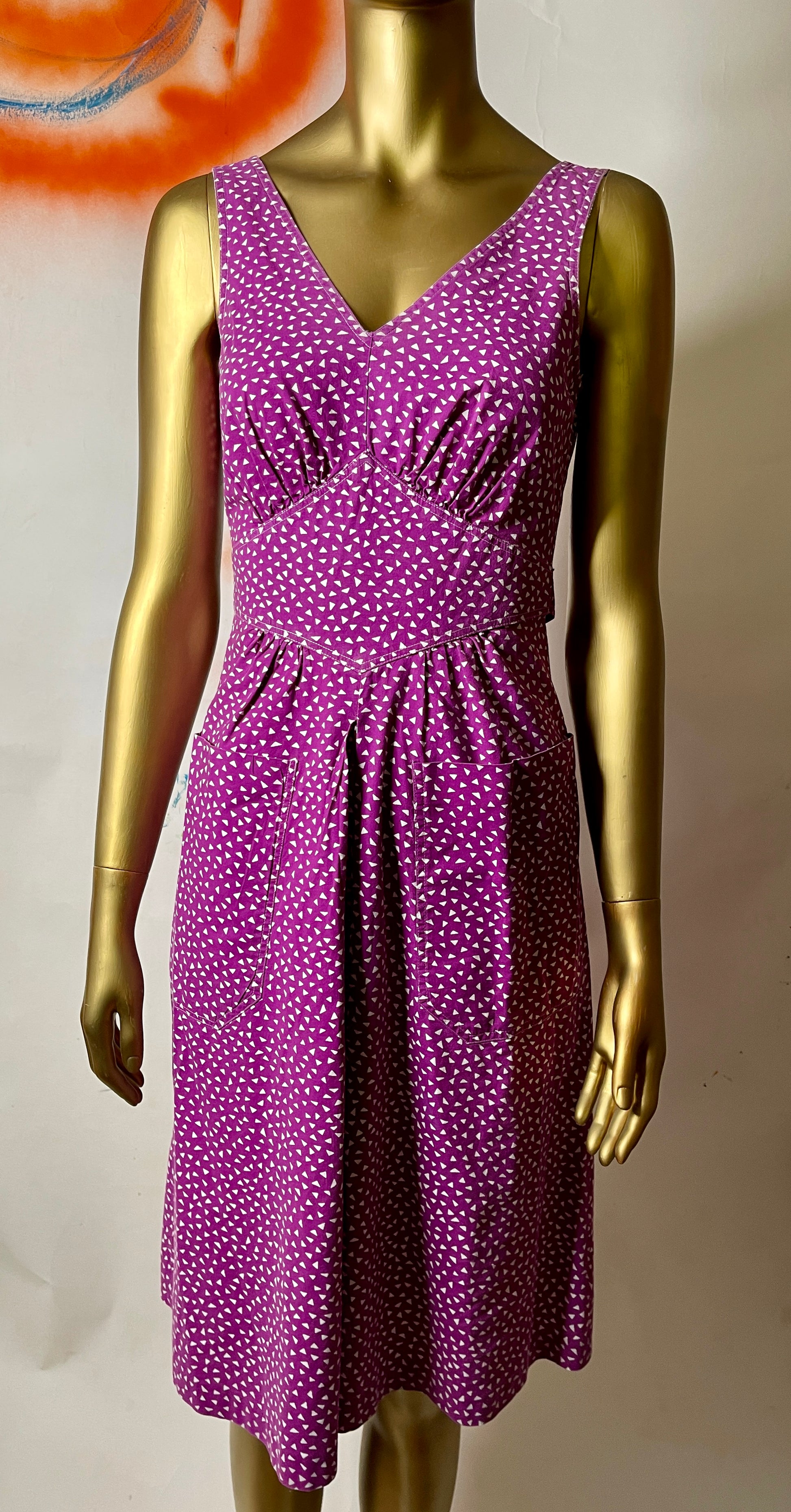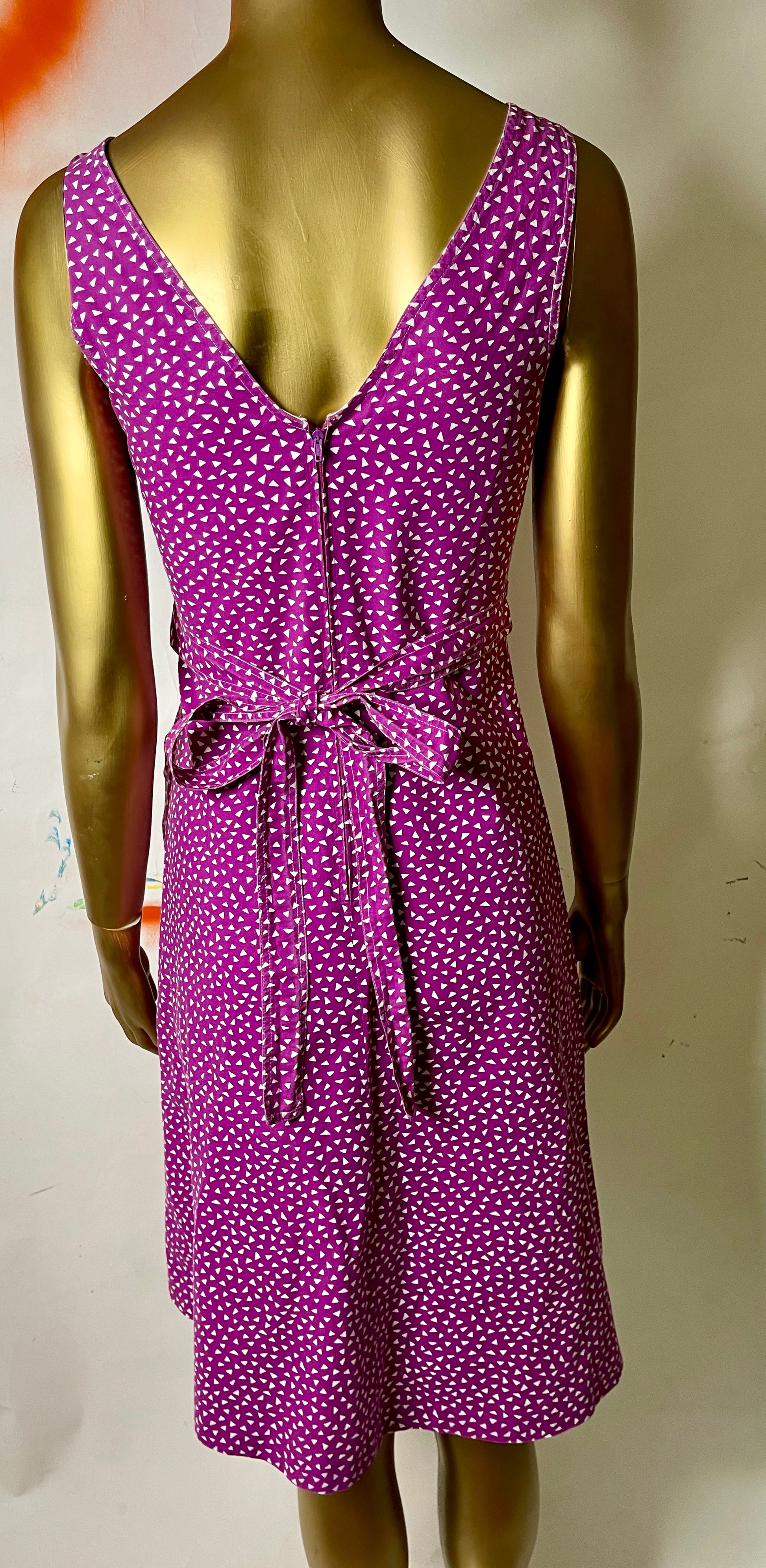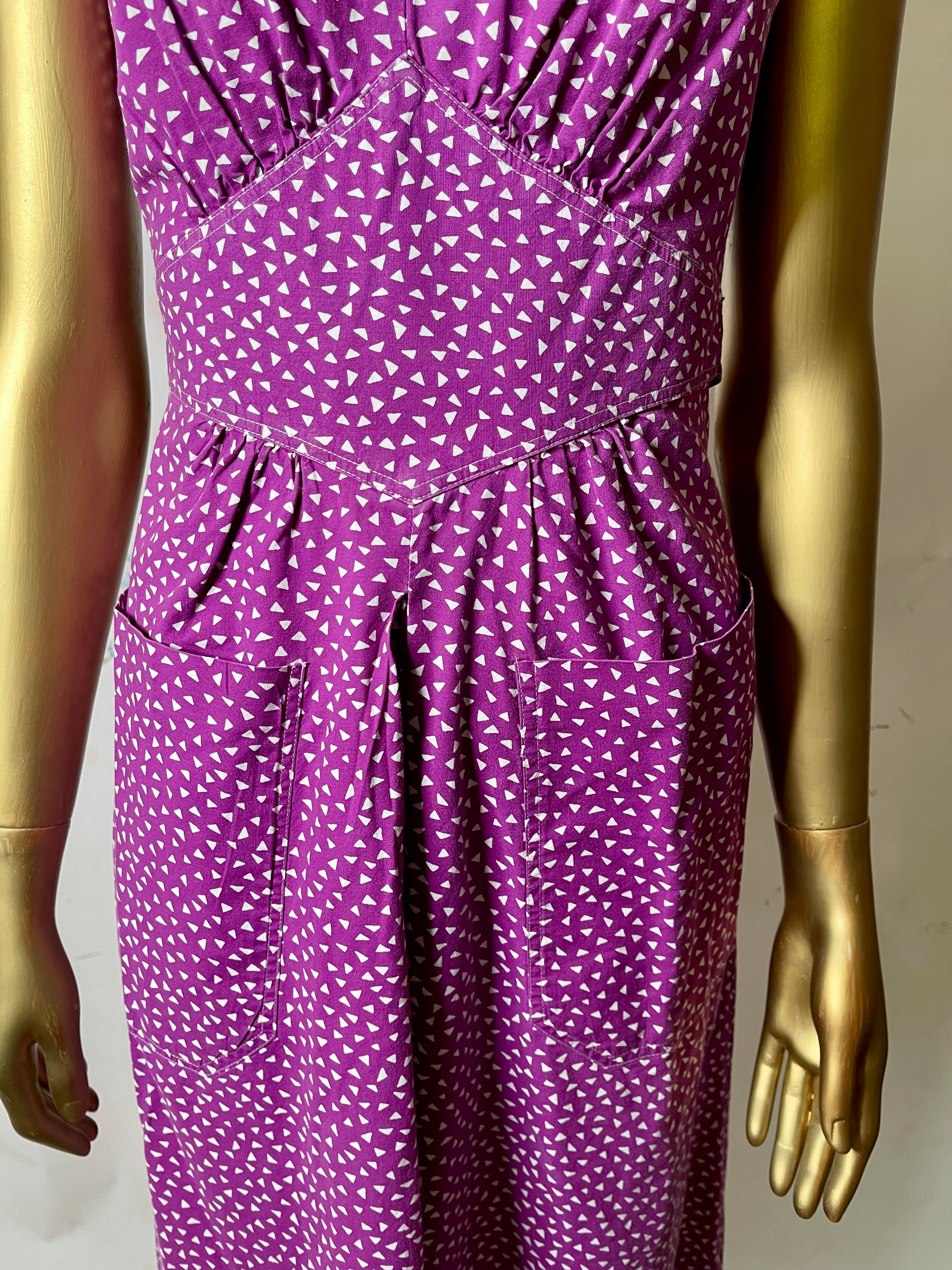 Description: In excellent vintage condition from the 1980s. Has two front pockets, tailored waist, and a zippered and tie back. Purple with white triangles.