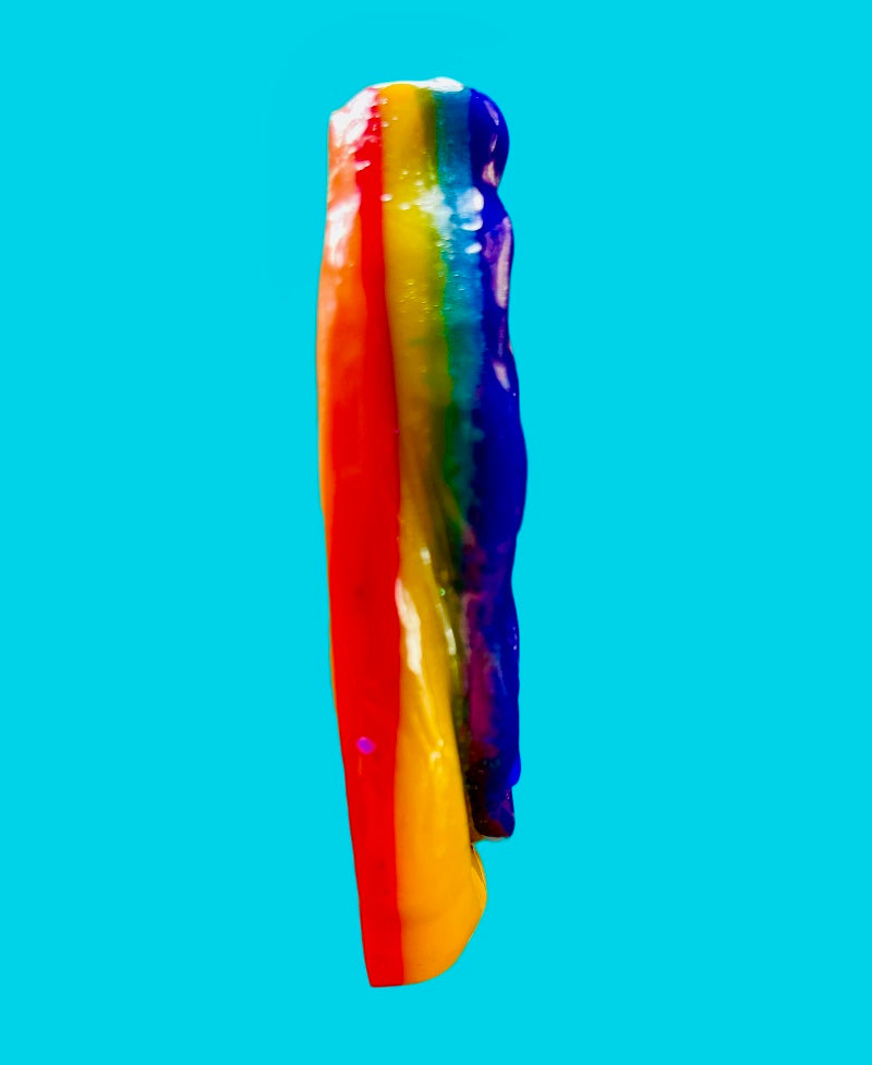 It is handcrafted from epoxy resin, acrylic, pigment, and washi. Each layer of color is poured separately, making the outcome one-of-a-kind, with slight variations in design.