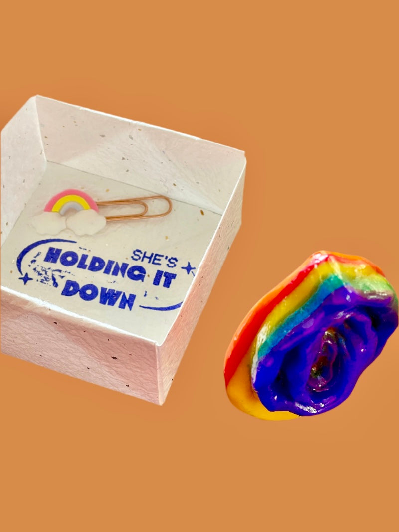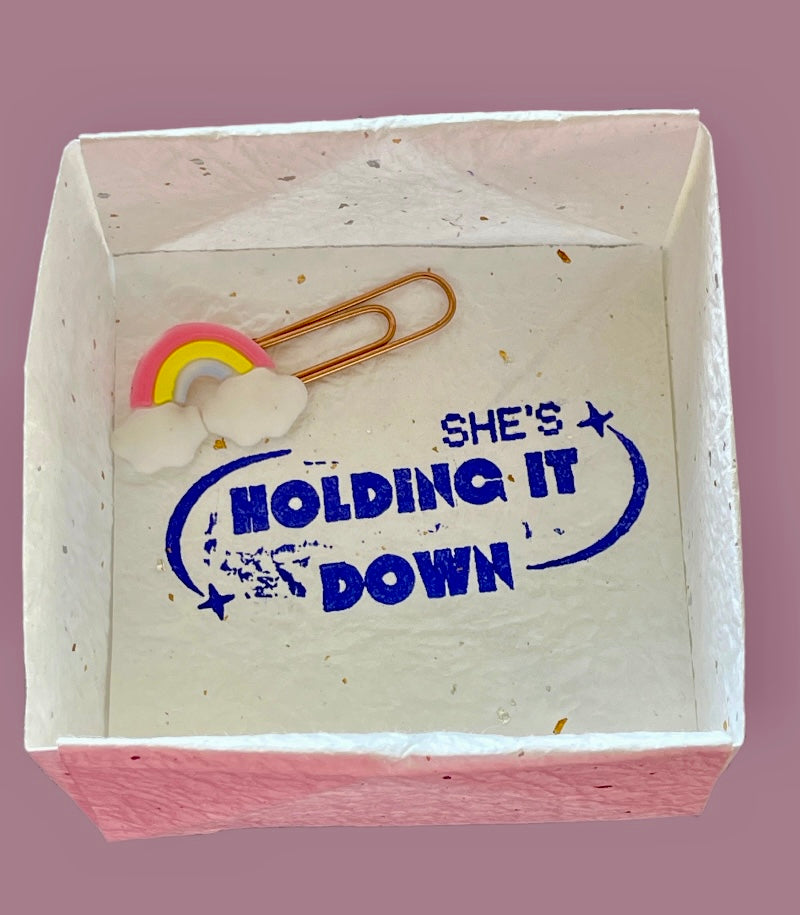 It comes packaged in a handmade origami washi masu box adorned with gold and silver speckles. The box is perfect for organizing your desk knickknacks. Also included is a rainbow paperclip.