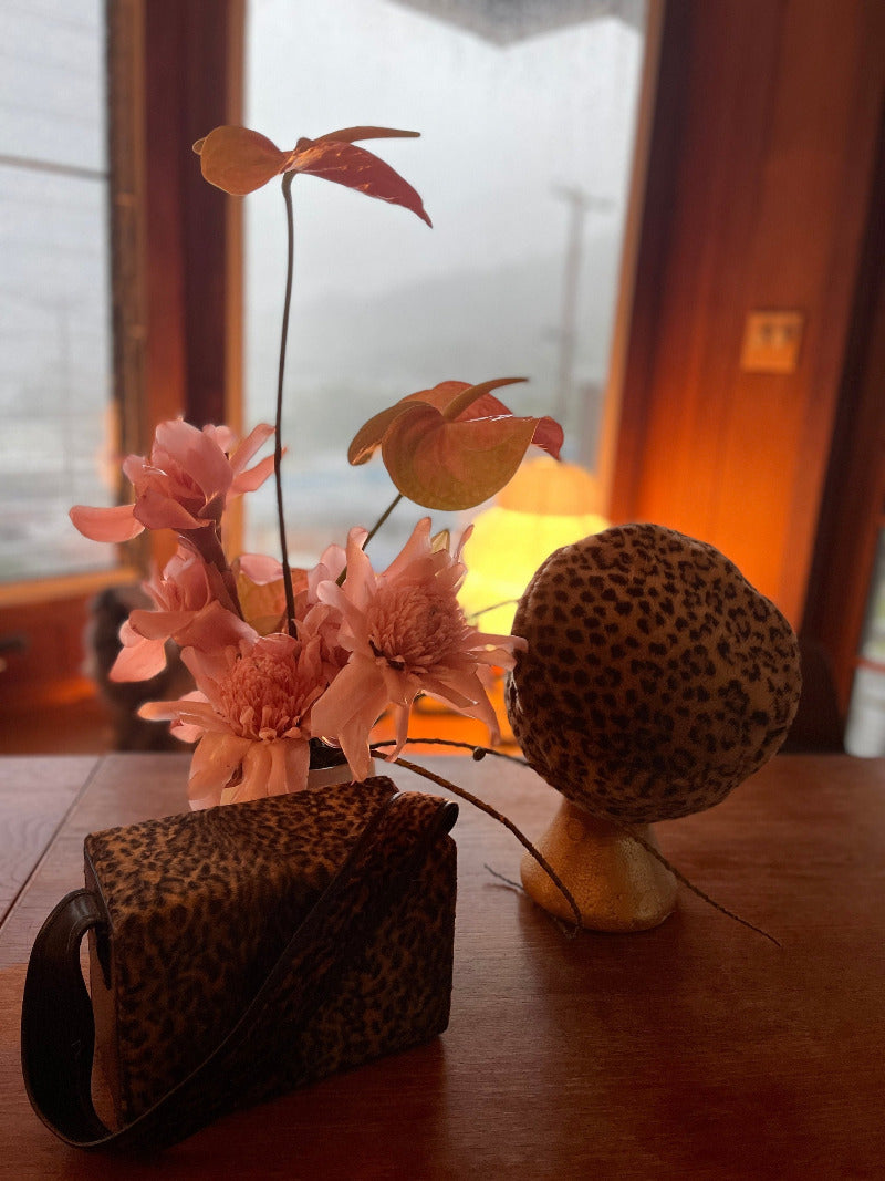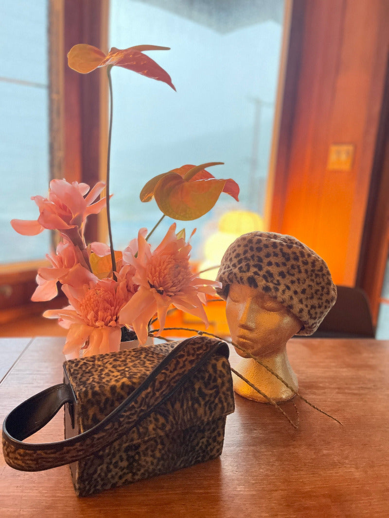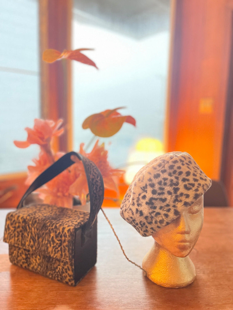 The pillbox hat, once a signature of Jackie O and Audrey Hepburn gets a 90s makeover in leopard print. Paired with the box clutch, this look purrs untamed glamour.