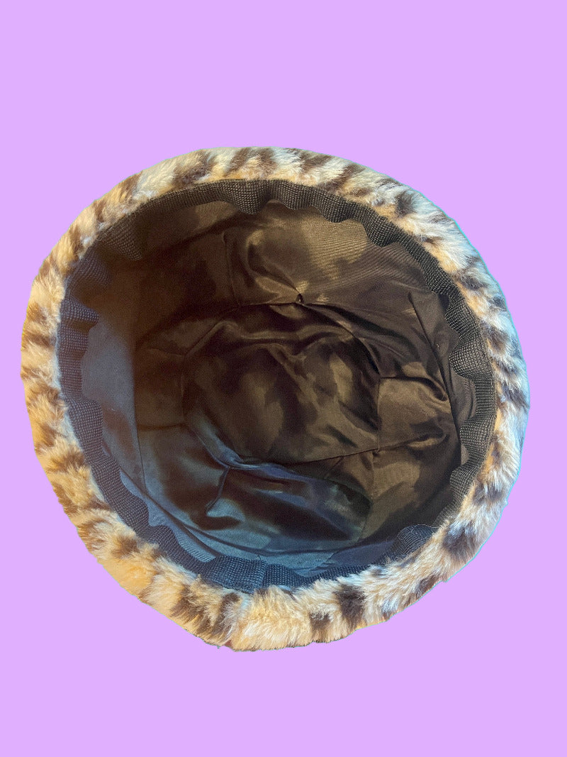Details: faux-fur, no label, lined, inner elastic band, circa 1960s, measures 27 inches in circumference and 9 inch crown